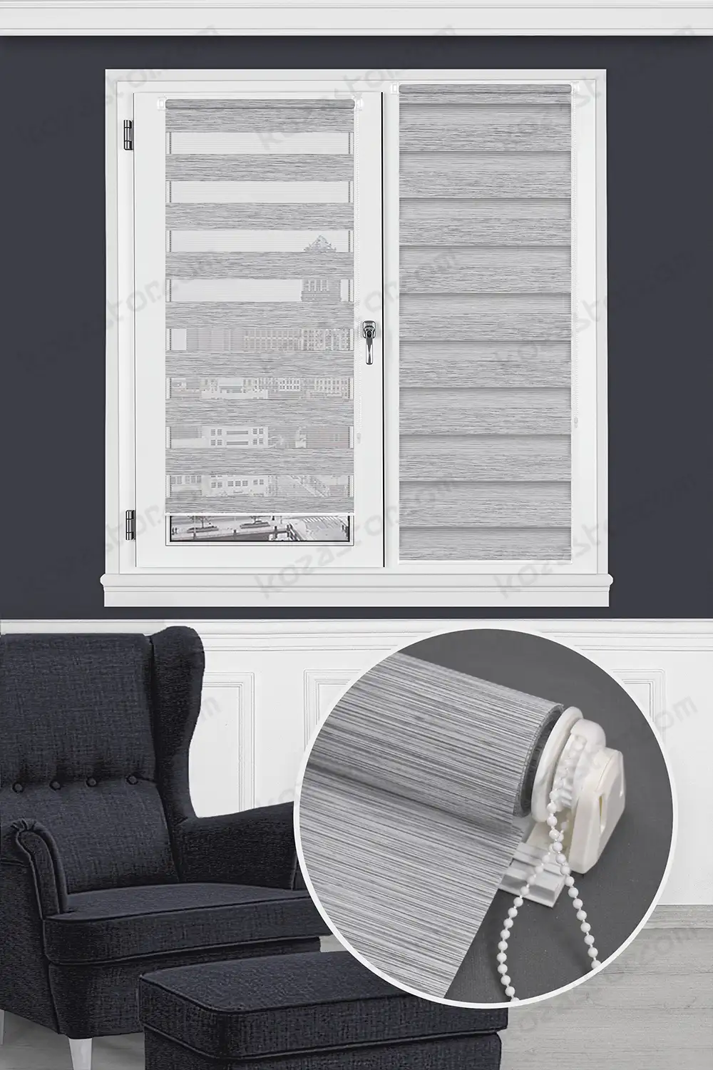Güneşi filtre edici, farklı renklerde kendine özgü apreli bir kumaşı olup, kasa üzerinde bulunan özel mekanizma rulosuna sarılı kumaşı mekanik zincir ile yukarı/aşağı (açılıp/kapanma) hareket ettirme kabiliyetine sahip, istenilen ölçülerde imalatı olan ve temizliği yapılabilen bir üründür.